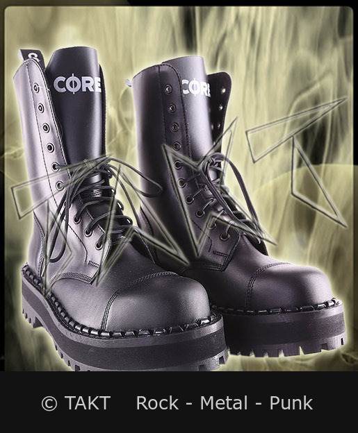 Kožené boty s kovovou špičkou. Barva: černá. Podrážka je prošívaná, lepená a zesílená šrouby. Výška podrážky Super Monster je cca 4 cm. Na jazyku i na podrážce bot je vytištěno logo CORE.