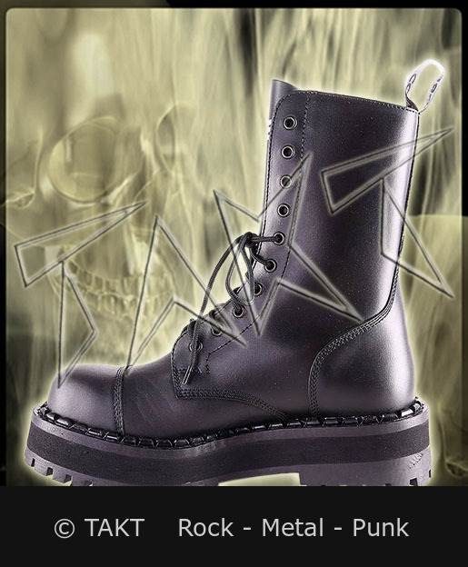 Super vypadající 10ti dírkové botyod firmy STEADY'S z černé kůže. Špička boty je vyztuženákovovou špicí. Šitá a lepená podrážka s kovovými šrouby. Pro