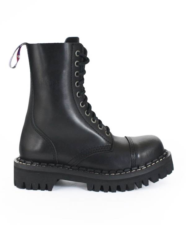 Kožené 10 dírkové boty značky STEADYS. Barva: černá. Boty jsou zdobené senzační výšivkou na vnější straně boty. Přední část je zpevněná ocelovou špicí s prošíváním. Boty mají lepenou podrážku zdobenou kovovými šrouby. Boty se vyrábí ve velikostech od 36 .
