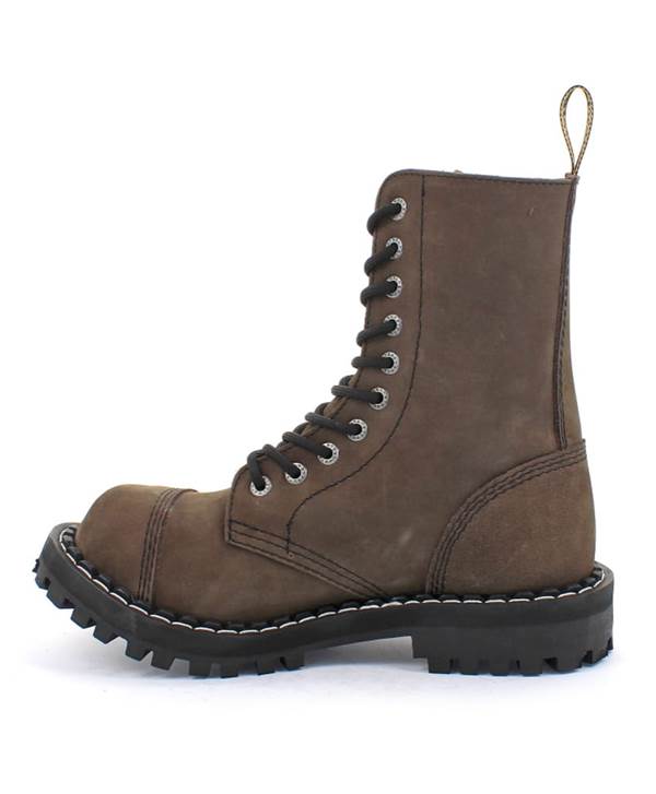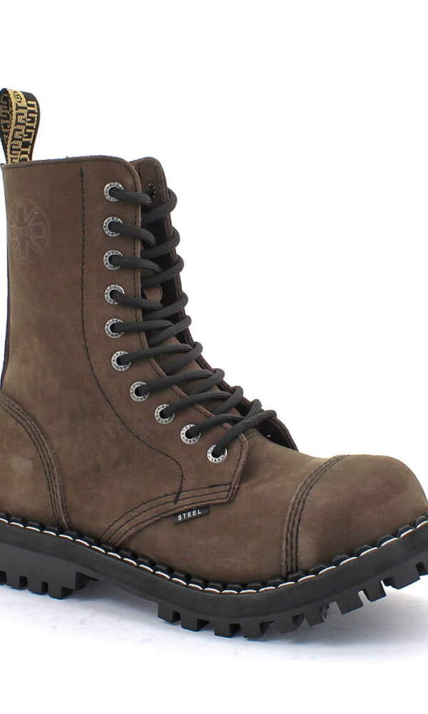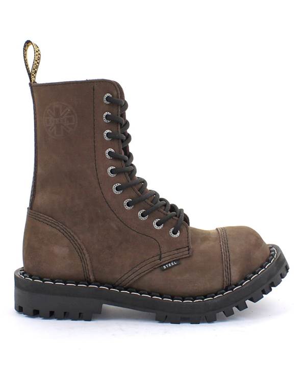 10 - ti dírkové boty s ocelovou špicí. Materiál: nubuk . Barva bronzová. Špička boty je vyztužená ocelovou špicí s prošitím. Klasická podrážka, šitá a lepená s kovovými šrouby. Výška podrážky cca 2,2 cm, podpatek cca 3,5 cm.