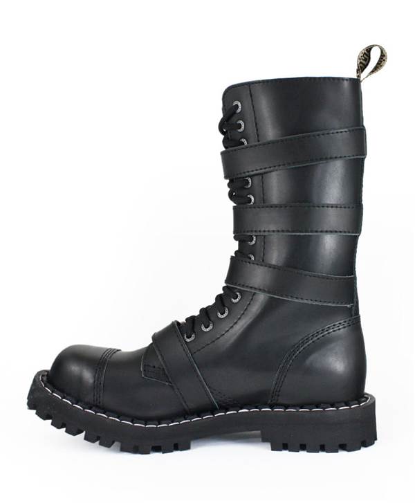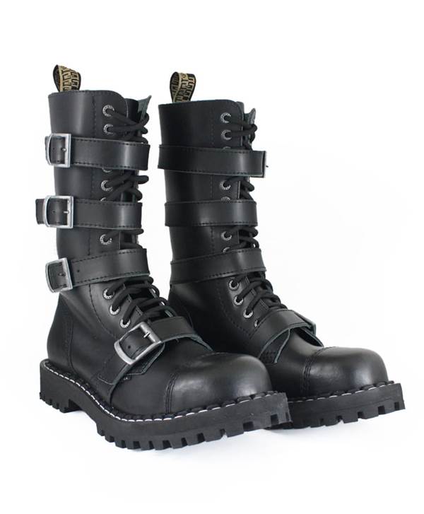 Kožené boty s ocelovou špičkou. Barva: černá. Špička boty je vyztužená ocelovou špicí s prošíváním. Klasická podrážka, šitá zdobená kovovými šrouby. Výška podrážky cca 2,2 cm. Celková výška boty cca 31 cm. Pro skvělý vizuální efekt jsou boty navíc vybaveny čtyřmi přezkami.