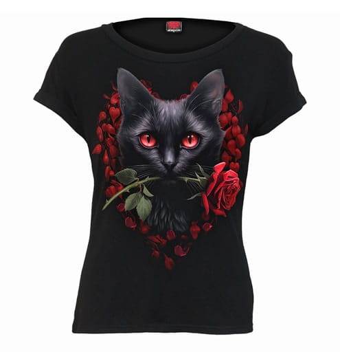Dámské tričko Cat Love je stylový a originální kousek z kolekce ikonické gothic značky SPIRAL. Na přední straně trička dominuje realistický motiv černé kočky s planoucíma rudýma očima, která drží v tlamě červenou růži, zasazená do srdcového rámce tvořeného růžovými okvětními lístky. Tento poutavý a romanticky temný design si zamilují milovnice gotického, alternativního i rockového stylu.