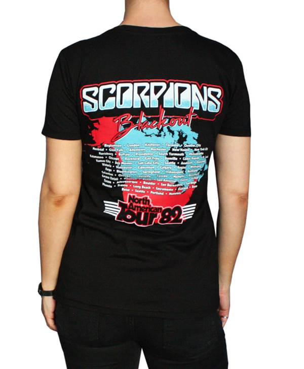 Dámské tričko Scorpions – Blackout je oficiální merchandise německé rockové legendy Scorpions, které vzdává poctu jejich ikonickému albu Blackout z roku 1982. Přední stranu zdobí nezaměnitelný obal alba s portrétem křičícího muže s obvazem přes hlavu a rozbitým sklem, zatímco zadní strana zachycuje seznam měst z tehdejší severoamerické tour.