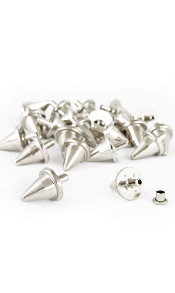 Kovové cvočky ve tvaru kůžele. Poniklovaný kovový odlitek stříbrné barvy. Způsob upevnění: zašroubování šroubu do závitového čepu. Cena je za 1 ks Rozměry: cca 1, 6 x 0, 8 cm