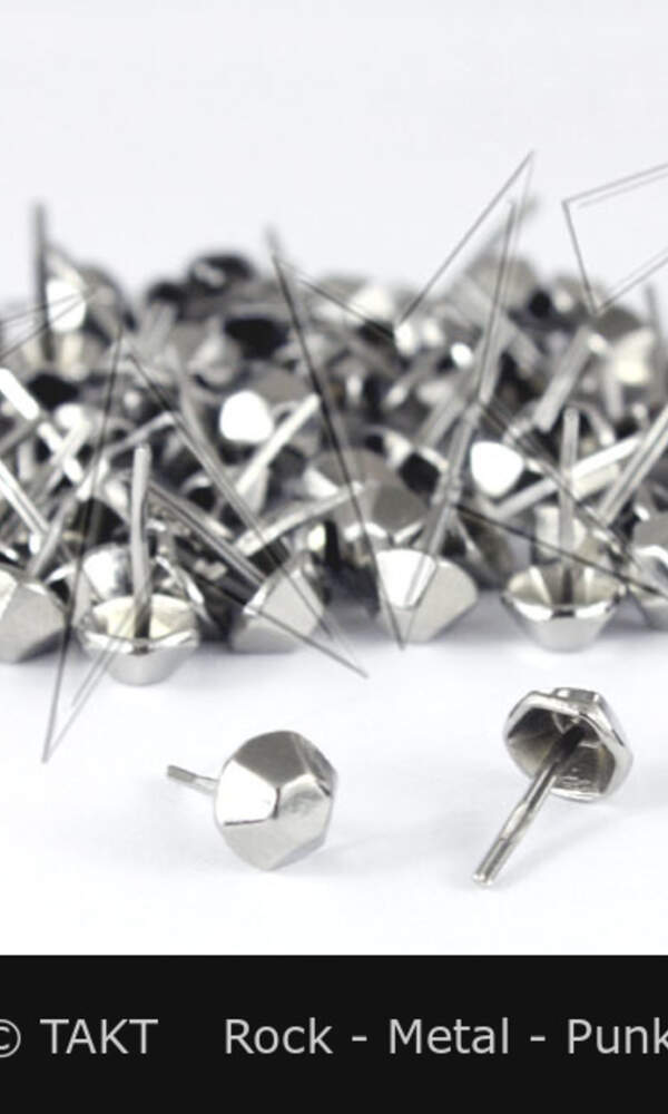 Kovové cvočky ve tvaru hrotu. Poniklované kovové odlitky. Stříbrná barva. Způsob montáže: zašroubování šroubu do závitového čepu. Rozměry: cca. 2, 5 x 1 cm Cena za 1 kus