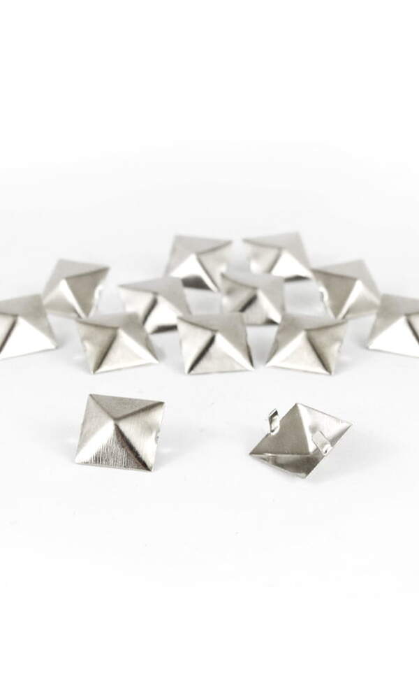 Kovové cvočky ve tvaru pyramidy. Cvočky lisované z nerezového plechu. Rozměry: 1,5 x 1,5 cm. Způsob připevnění: zasunutí do otvorů a ohnutí nohou. Cena za 1 položku