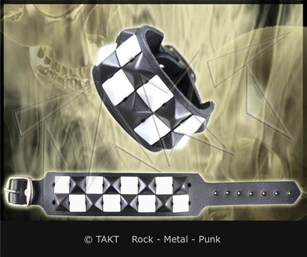 Kovové pyramidy černo - bílé barvy o velikosti 1,2x1,2 cm. Opasek na ruku má klasické zapínání na kovovou přezku. Jeho rozměry jsou cca : šířka 3 cm, regulovatelná délka zapnutí na zápěstí je 15,5 až 21,5 cm
