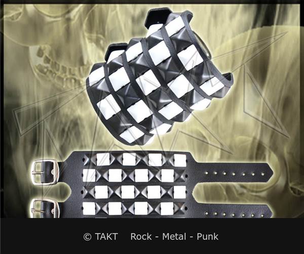 Kovové pyramidy černo - bílé barvy o velikosti 1,2x1,2 cm. Opasek na ruku má klasické zapínání na kovovou přezku. Jeho rozměry jsou cca : šířka 8 cm, regulovatelná délka zapnutí na zápěstí je 16 až 22 cm
