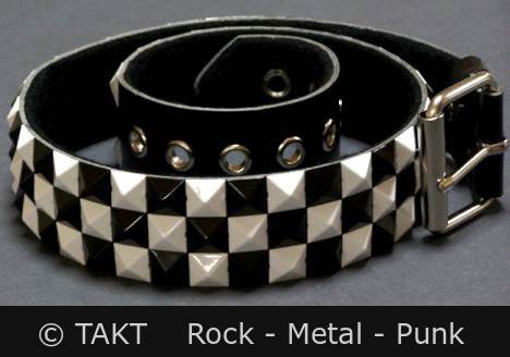 kožený pásek , zdobení - střídavě vedle sebe černé a bílé kovové pyramidy o velikosti 15x15mm, které jsou vsazeny ve třech řadách pod sebou. Kožený pásek je v černé barvě s klasickou kovovou přezkou. Šířka pásku je 4,7 cm.