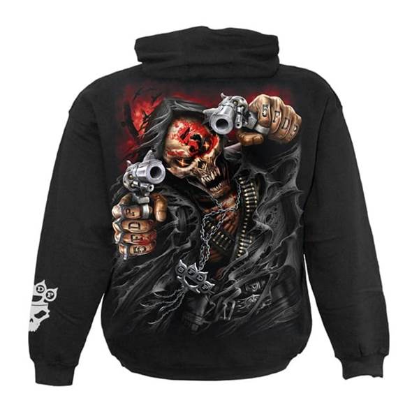 Mikina klokan Assassin je extrémně působivý kousek určený všem fanouškům americké groove/metalové kapely Five Finger Death Punch. Mikina zaujme na první pohled detailním a agresivním potiskem – na přední straně najdeš lebku s krvavými šrámy, která svírá zbraně s vyrytým nápisem *5FDP*, obklopenou řetězy a pekelnými výjevy. Zadní část pak nabízí dynamický výjev vražedného reaper-like zabijáka, který míří oběma hlavněmi přímo na tebe – čistá vizuální smršť pro metalové srdce.
