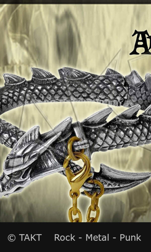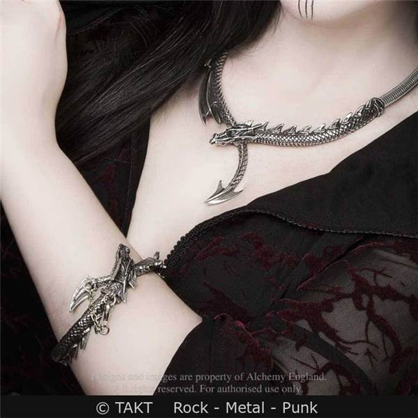 ALCHEMY ENGLAND. Kovový náramek stříbrné barvě ve tvaru drak.