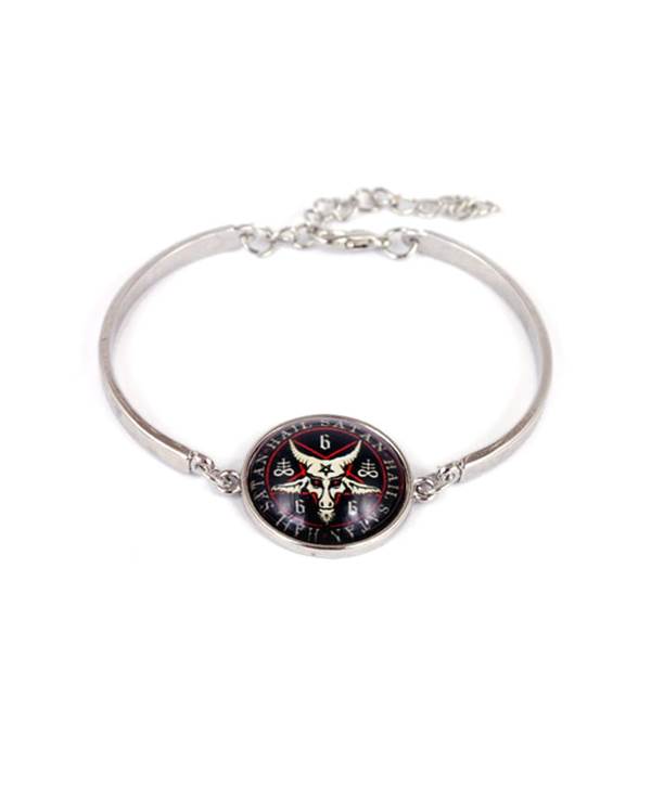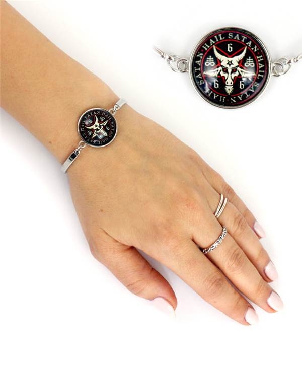 Velmi elegantní náramek ve stříbrné barvě skládající se z ozdoby v podobě ďábla o průměru cca 3 cm. Zapínání náramku je na karabinku, celková délka cca 22 cm a šířka náramku cca 1 cm.