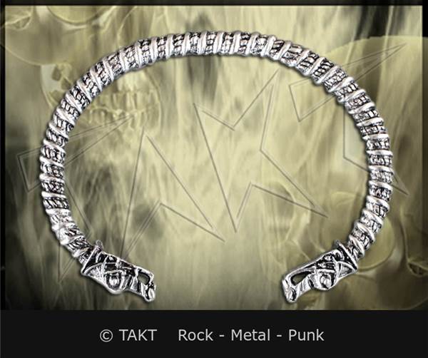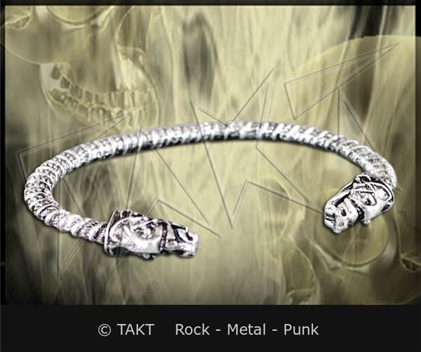 Kovový náramek v barvě starého stříbra, zdobený ornamenty lebek. Rozměry: šířka cca 1 x 0, 7 cm, vnitřní obvod cca 21 cm, max ok. 25, 5 cm