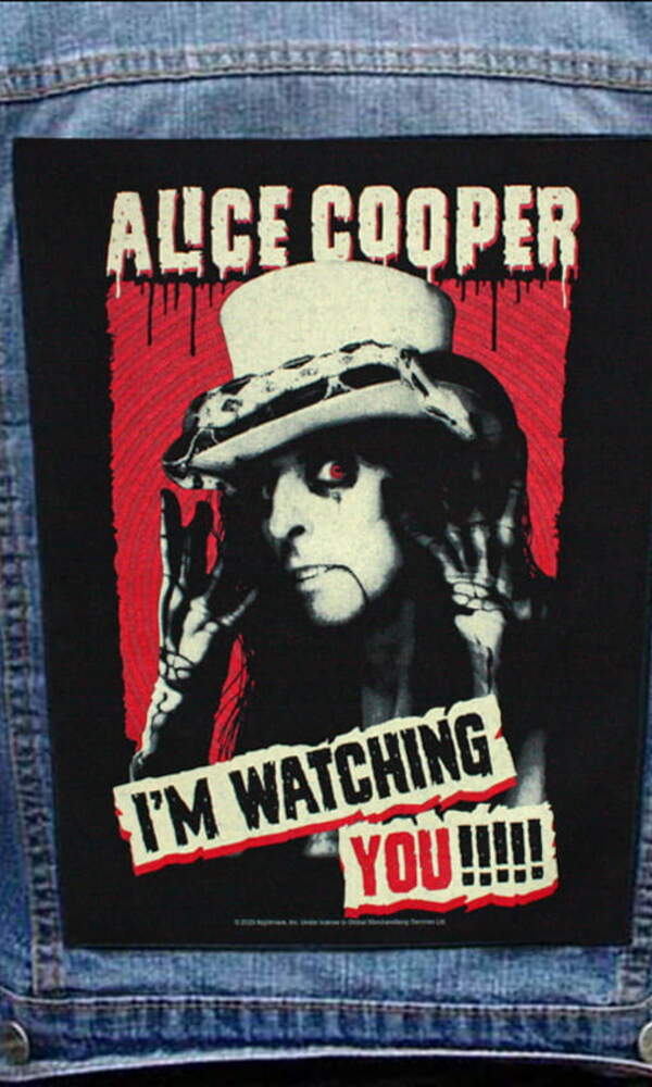 Nášivka na bundu Alice Cooper - Im Watching You je velká nášivka na bundu s obšitými okraji, takže se velmi snadno přišívá nebo připíná. Potisk je provedený sítotiskem a rozměry přibližně 36 cm na výšku a 29 x 26 cm na šířku z ní dělají výrazný backpatch, který na džínové i jiné bundě opravdu vynikne.