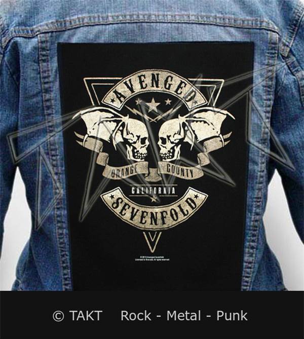 Velikost: výška 36 cm, horní šířka 29 cm a spodní 26 cm. Kvalitní potisk a obšití. Materiál: polyester. Ideální ozdoba pro jeansové bundy - velká nášivka Avenged Sevenfold. Licence