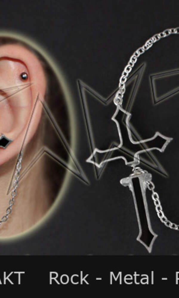 Je vyrobena z odlitku kovu ve tvaru kříže, stříbrné barvy, zdobená černou hmotou. Náušnici zdobí řetízek o délce cca 15,5 cm. Celkový vzhled působí originálně.