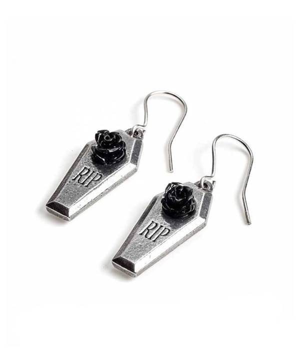 Kovové náušnice ve tvaru rakve černými růžemi. Prodává se jako pár (2 ks).