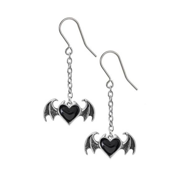 Miniaturní náušnice ve tvaru srdce, levá a pravá, ze starého cínu, smaltované na černo, s jedním křídlem netopýra.