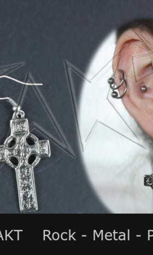 Je vyrobena z odlitku kovu ve tvaru kříže, stříbrné barvy, zdobená černou hmotou. Náušnici navíc zdobí řetízek o délce cca 15, 5 cm. Celkový vzhled pa