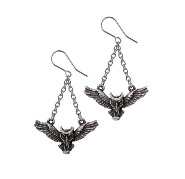 Ručně vyrobené náušnice z vysoce kvalitního anglického cínu s pro Alchemy charakteristickým patinovaným povrchem. Každá náušnice představuje krásně ztvárněnou sovu v letu zavěšenou na jemných řetízcích.