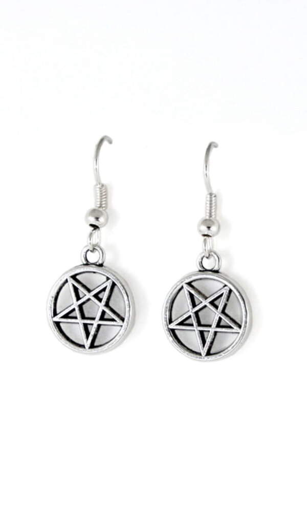 Kovový odlitek náušnic ve tvaru pentagramu v černé barvě. Velikost: průměr cca 4, 5 cm (měřeno bez náušnice).