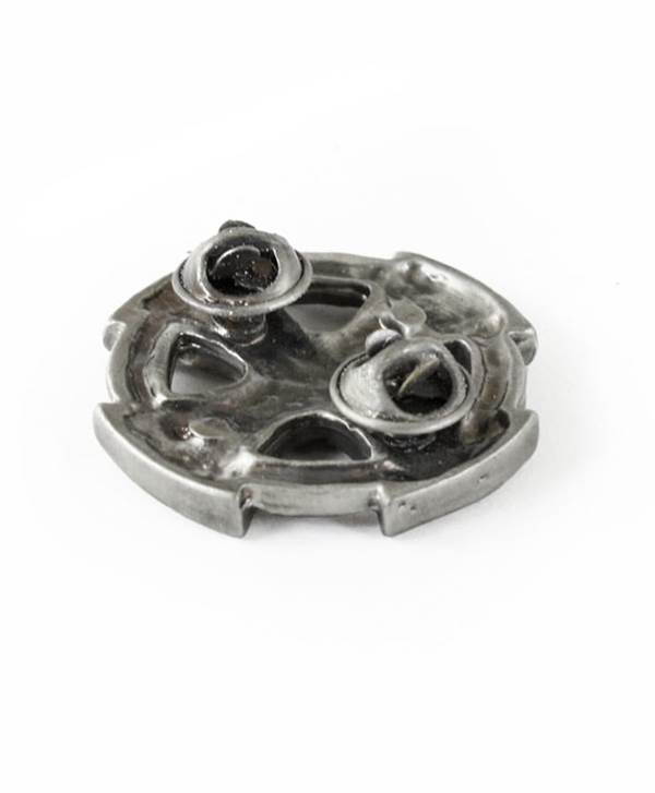Kovový odznak. Připevňuje se propíchnutím materiálu a připevněním bezpečnostní zarážky.