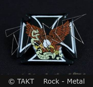 Kovový odznak lakovaný - Kříž - Ride Free. Rozměry cca 2,5 x 2 cm.