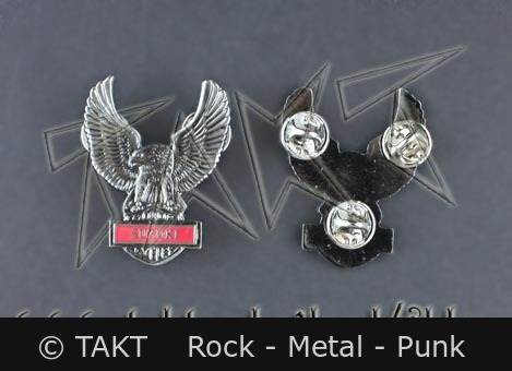 Kovový odznak. Připevňuje se propíchnutím materiálu a připevněním bezpečnostní zarážky. Rozměry: přibližně 3, 5 x 3, 5 cm.