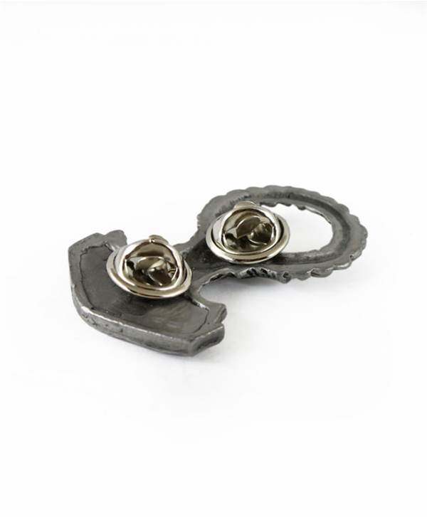 Kovový odznak. Připevňuje se propíchnutím materiálu a připevněním bezpečnostní zarážky.