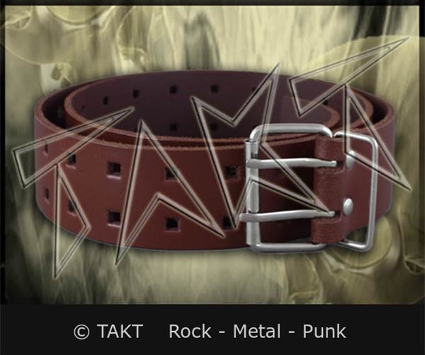 hnědé barvy s klasickou kovovou přezkou zdobený dírkami ve tvaru čtverce. Univerzální kožený opasek, který se hodí nejen ke všem druhům kalhot, ale také i kraťasům. Tento kožený pásek je o šířce cca 4 cm a celkové délce 102 cm.