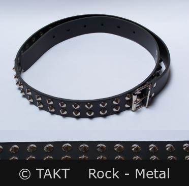 Kvalitní kožený pásek z hrubé černé kůže s klasickou kovovou přezkou, zdobení - lesklé kovové kužely o průměru cca 1 cm, které jsou hustě vsazeny ve dvou řadách. Šířka pásku je 3 cm.