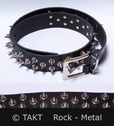 Kvalitní kožený pásek z hrubé černé kůže s klasickou kovovou přezkou, zdobení lesklé kovové kužely o velikosti 1,2 x 1,3 cm, které jsou hustě vsazeny ve třech řadách. Šířka pásku je 4 cm.