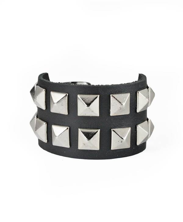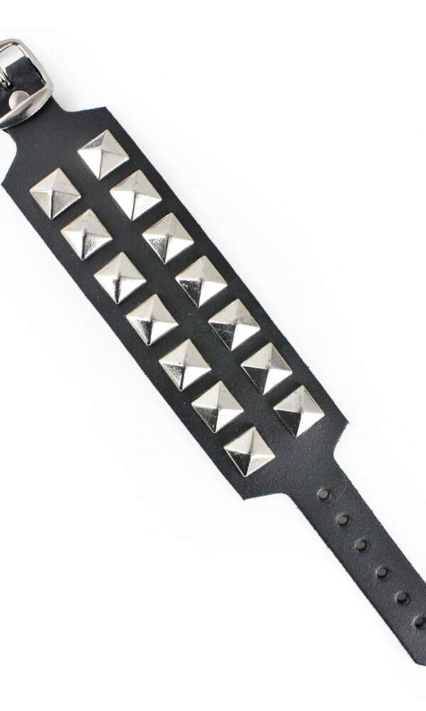 Kovové pyramidy černo - bílé barvy o velikosti 1, 2x1, 2 cmOpasek na ruku má klasické zapínání na kovovou přezkuJeho rozměry jsou cca: šířka 3 cm, regulovatelná délka zapnutí na zápěstí je 15, 5 až 21, 5 cm