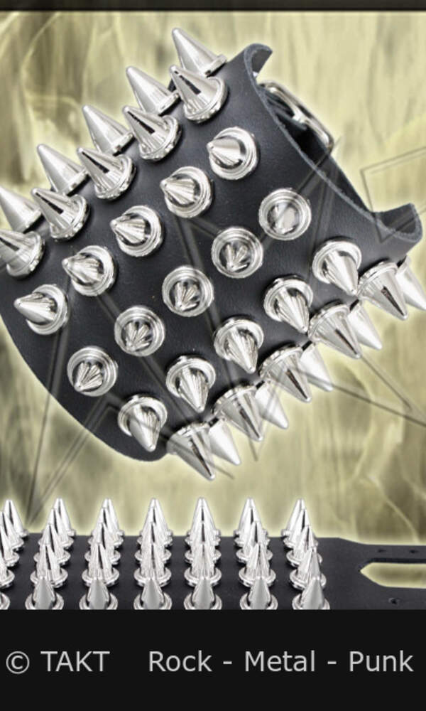 Barva: černá, kovové středně velké kuželové trny o průměru 11mm a délky 15mm. Opasek na ruku má klasické zapínání na kovovou přezku. Jeho rozměry jsou cca : šířka 8 cm, regulovatelná délka zapnutí na zápěstí je 25 až 17,5 cm