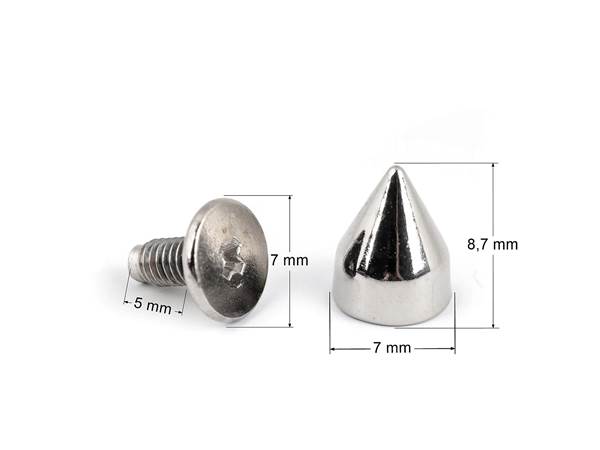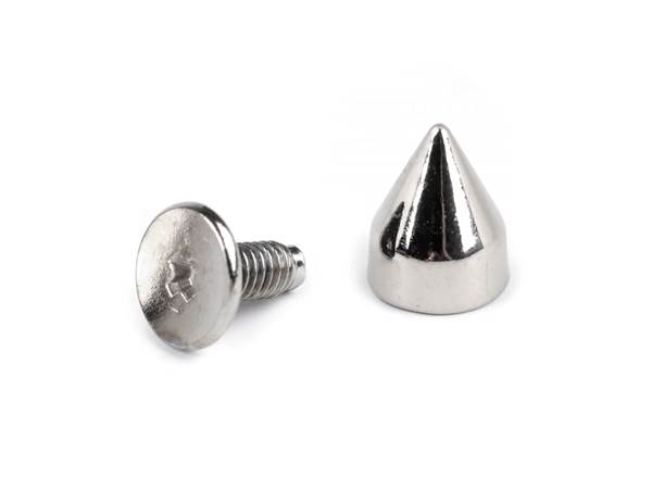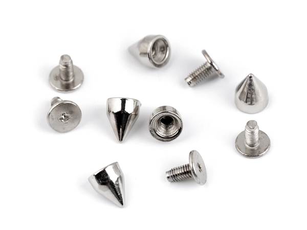 Kovové cvoky ve tvaru hrotu. Poniklovaný kovový odlitek. Barva: stříbrná. Způsob upevnění: zašroubování šroubu do závitu trnu. Rozměry: přibližně 2, 5 x 0, 8 cm. Cena za 1 kus