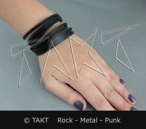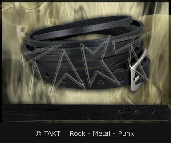 Pás na ruku je vyroben z kůže . Barva: černá. Pásek se skládá ze tří tenčích pásků. Délka pásku umožňuje trojité ovinutí kolem zápěstí a tím dodá lepší efekt. Zapínání je na sponu stříbrné barvy. Rozměry: šířka cca 1 cm, celková délka cca 59 cm, délka otvorů cca 49 - 57 cm.