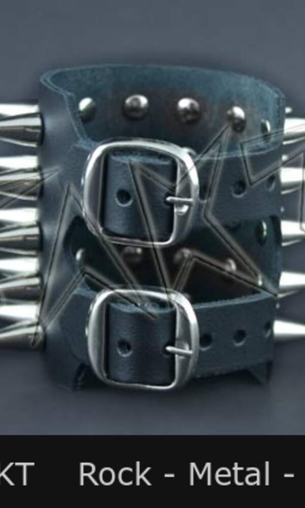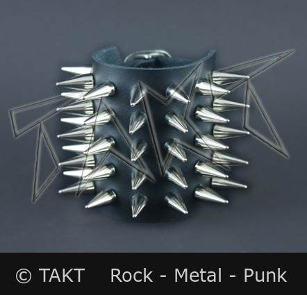 Barva: černá, kovové středně velké kužely o průměru 10mm. Opasek na ruku má klasické zapínání na kovovou přezku. Jeho rozměry jsou cca: šířka 8 cm, regulovatelná délka zapnutí na zápěstí je 23 až 17 cm
