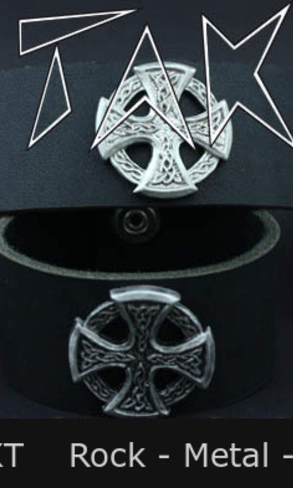 Atraktivní pásek z kůže o šířce cca 4 cm x 22 cm délky. Zdobený litinovou ozdobou ve tvaru kříže. Zapínání je na dva cvoky.