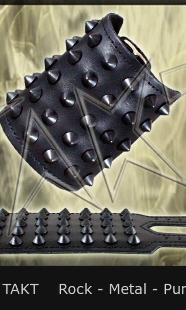 Barva: černá, kovové středně velké kůželové trny o průměru 11mm a délky 15mm. Opasek na ruku má klasické zapínání na kovovou přezku. Jeho rozměry jsou cca: šířka 8 cm, regulovatelná délka zapnutí na zápěstí je 25 až 17, 5 cm