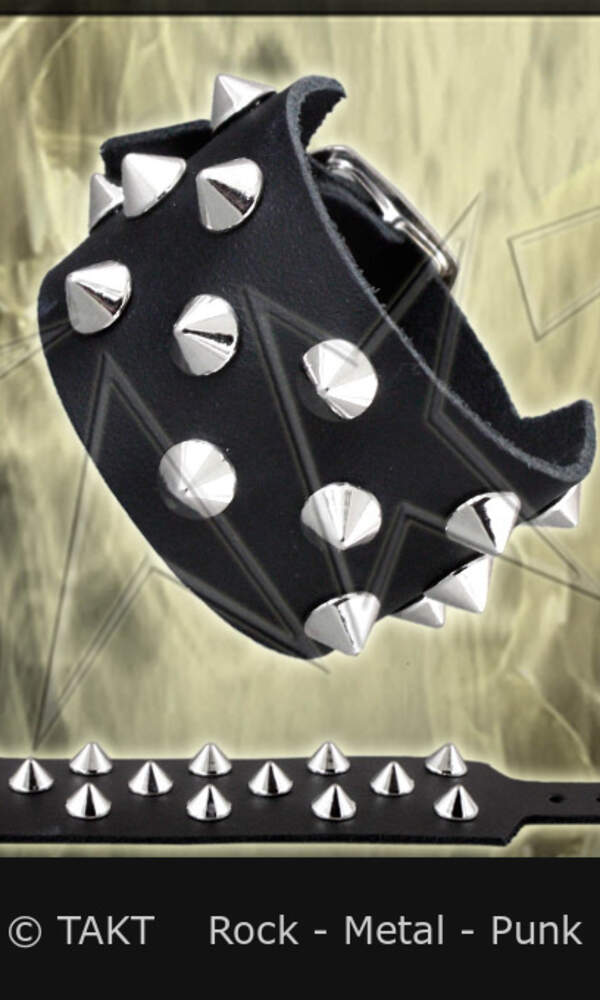 . Barva: černá, kovové středně velké kužely o průměru 10mm. Opasek na ruku má klasické zapínání na kovovou přezku. Jeho rozměry jsou cca: šířka 4 cm, regulovatelná délka zapnutí na zápěstí je 23 až 16 cm