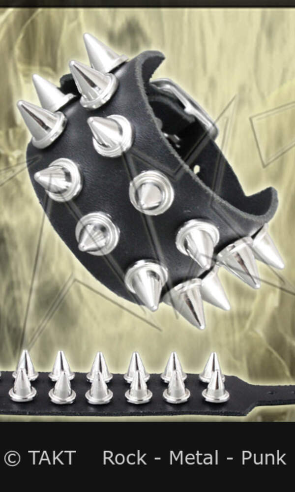 Barva: černá, kovové středně velké kuželové trny o průměru 12mm a délky 13mm. Opasek na ruku má klasické zapínání na kovovou přezku. Jeho rozměry jsou cca : šířka 4,5 cm, regulovatelná délka zapnutí na zápěstí je 25 až 17 cm.