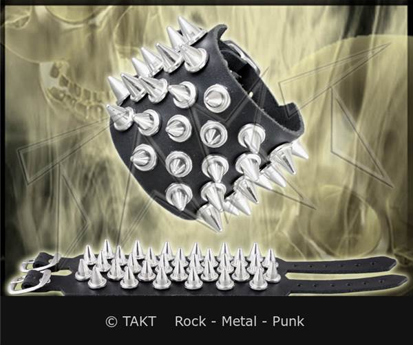 . Barva: černá, kovové středně velké kuželové trny o průměru 12mm a délky 13mm. Opasek na ruku má klasické zapínání na kovovou přezku. Jeho rozměry jsou cca : šířka 6 cm, regulovatelná délka zapnutí na zápěstí je 26 až 18,5 cm.