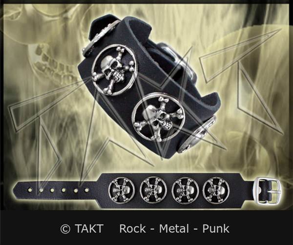 Opasek na ruku je vyroben z kůže . Barva: černá, zdobený lebkami v kruhu o průměru cca 2,3 cm. Zapínání je na sponu. Rozměry: šířka opasku cca 3 cm, délka (bez spony) cca 22 cm, délka dírkování cca 15,5 20,5 cm.