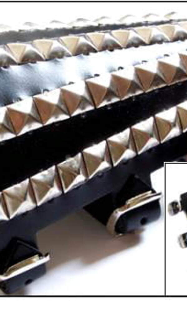 Zapínání na tři spony, zdobený pyramidami o velikosti 1,3 x 1,3 cm. Rozměr: šířka cca 16,5 cm délka u zápěstí cca 17,5 až 23 cm, pod loktem cca 25 až 33 cm.