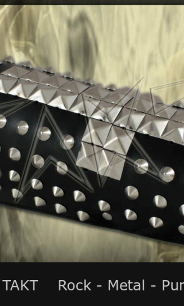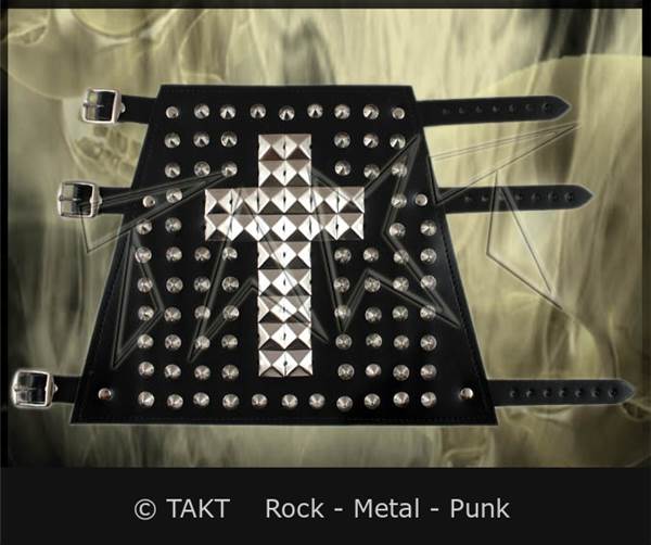 kožený náramek s kužely o průměru cca 1 cm a pyramidy o průměru cca 1,5 x 1,5 cm. Náramek má Zapínání na tři kovové přezky. Rubová strana náramku je podšitá látkou. Rozměry: délka cca 19,5 cm, šířka cca 15 25 cm.