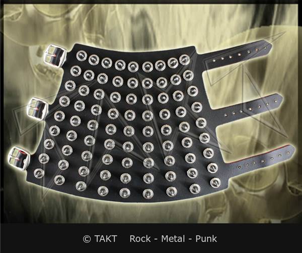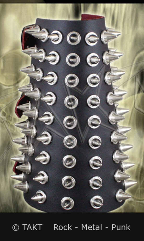 Barva: černá zdobený stříbrnými kužely typu SPIKE se zapínáním na 3 přezky. Velikost kůželů cca 1 x 2 cm. Rozměr pásku: šířka cca 16, 5 cm délka u zápěstí cca 17 až 22 cm, pod loktem cca 24, 8 až 30 cm.