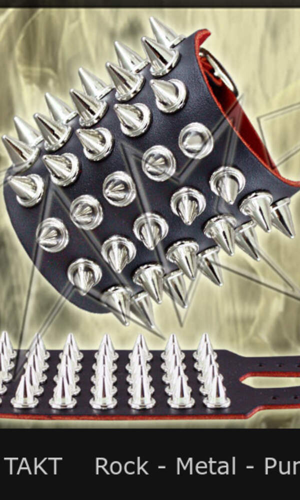 Opasek na ruku . Barva: černá s nízké a vysoké špicemi stříbrné barvy, materiál kůže, zapínání je na sponu. Rozměry: šířka opasku cca 8 cm, délka dírkování cca 16 22 cm.