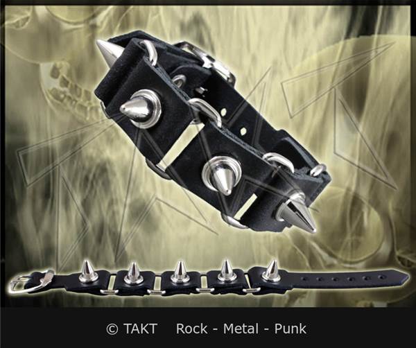 Opasek na ruku. Barva: černá s hroty vysoké stříbrné barvy o rozměru cca 2, 8 cm, materiál kůže, zapínání je na sponu. Rozměry: šířka cca 2, 5 cm, pro obvod zápěstí cca 16, 5 - 22, 5 cm.