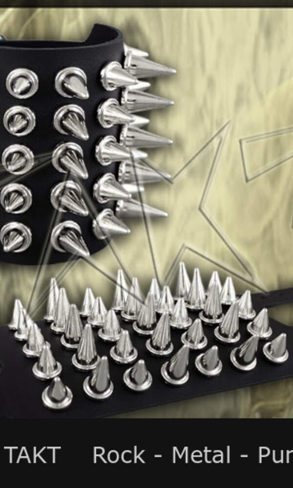 Barva: černá, kovové středně velké kužely o průměru 10mm. Opasek na ruku má klasické zapínání na kovovou přezku. Jeho rozměry jsou cca: šířka 8 cm, regulovatelná délka zapnutí na zápěstí je 23 až 17 cm