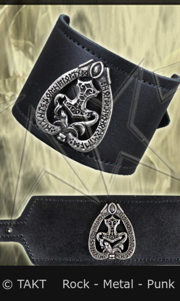 Kožený opasek na ruku . Barva: černá. Zdobený kovový odlitek ve tvaru thorovo kladivo. Jeho rozměry jsou cca : šířka 5 cm, regulovatelná délka zapnutí na zápěstí cca 18 - 24 cm.